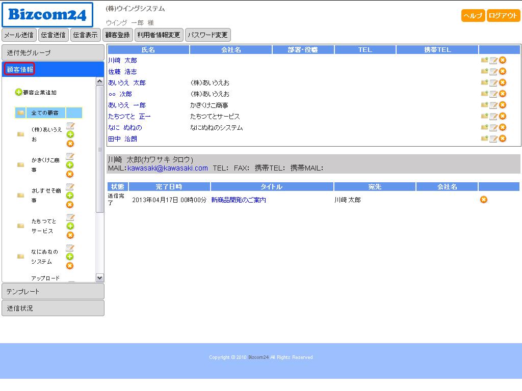 顧客情報では利用者の顧客が所属する企業情報と、顧客自身の情報を管理できる機能です。