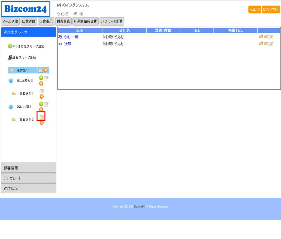 左メニューの送付先グループ横の編集アイコンをクリックすると