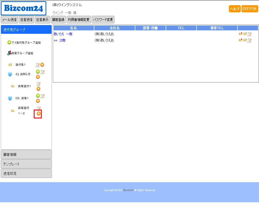 左メニューの送付先グループ横の削除アイコンをクリックすると
