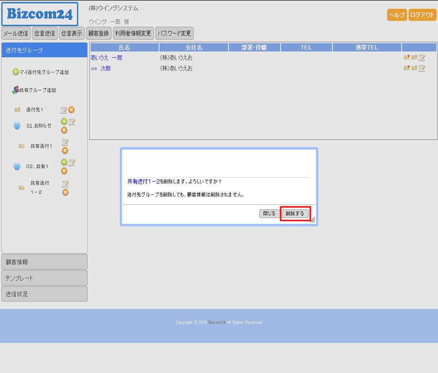 送付先グループを削除しない場合は「閉じる」をクリックしてください。