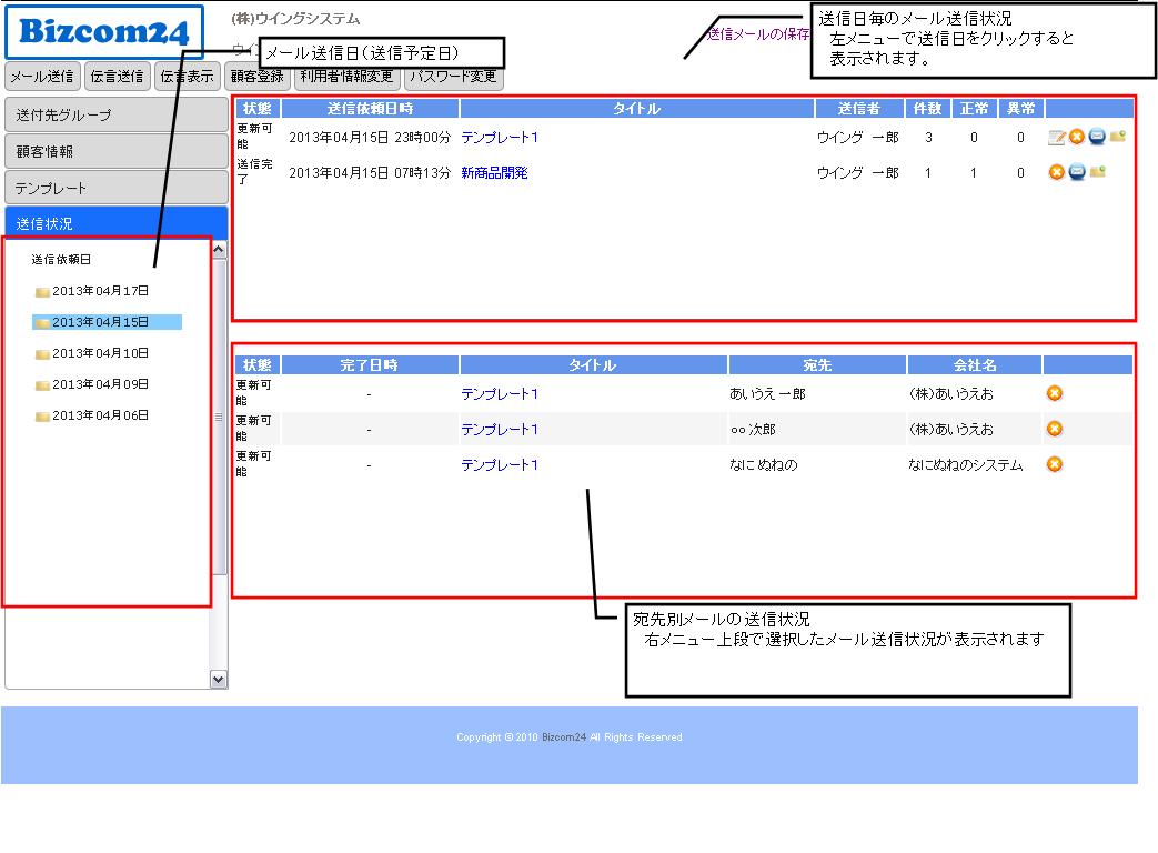 送信状況画面は各利用者がBizcom24で作成したメールを一括管理する機能です。