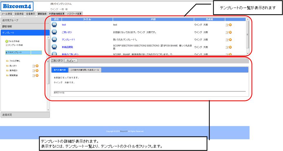 テンプレート画面は、メール送信時に利用するメールテンプレートを管理する画面です。