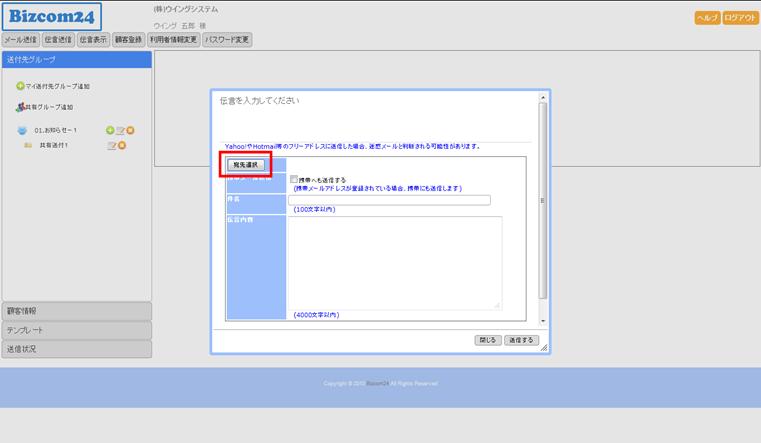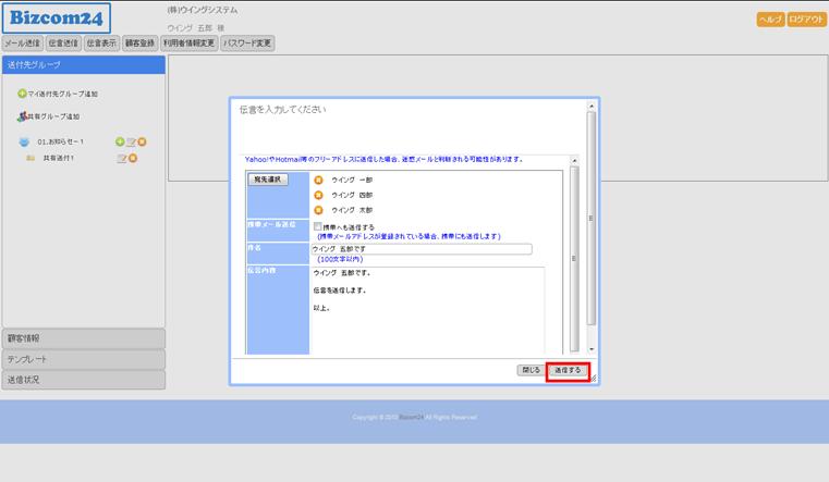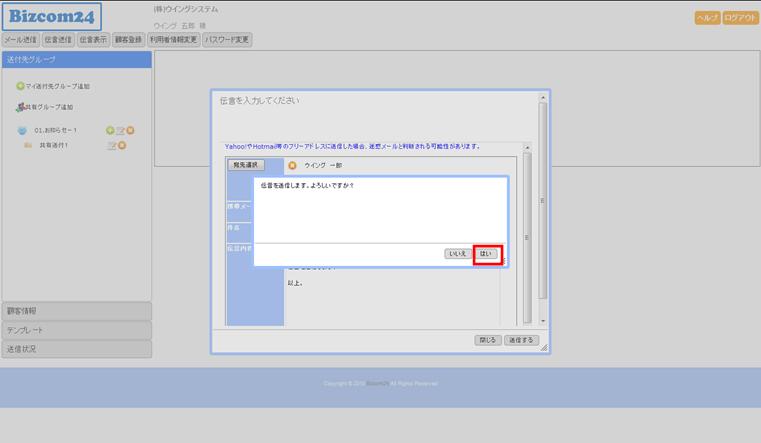 伝言送信確認画面が表示されますので、内容に間違いなければ「はい」をクリックしてください。