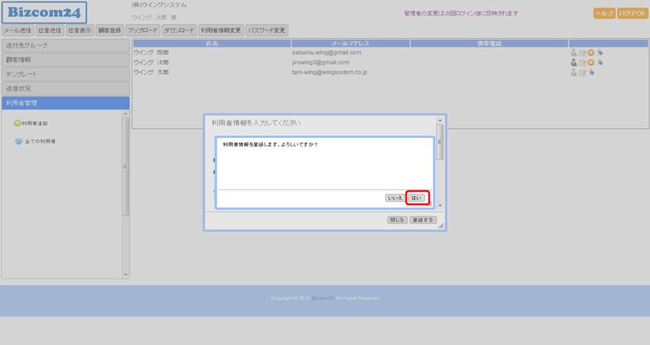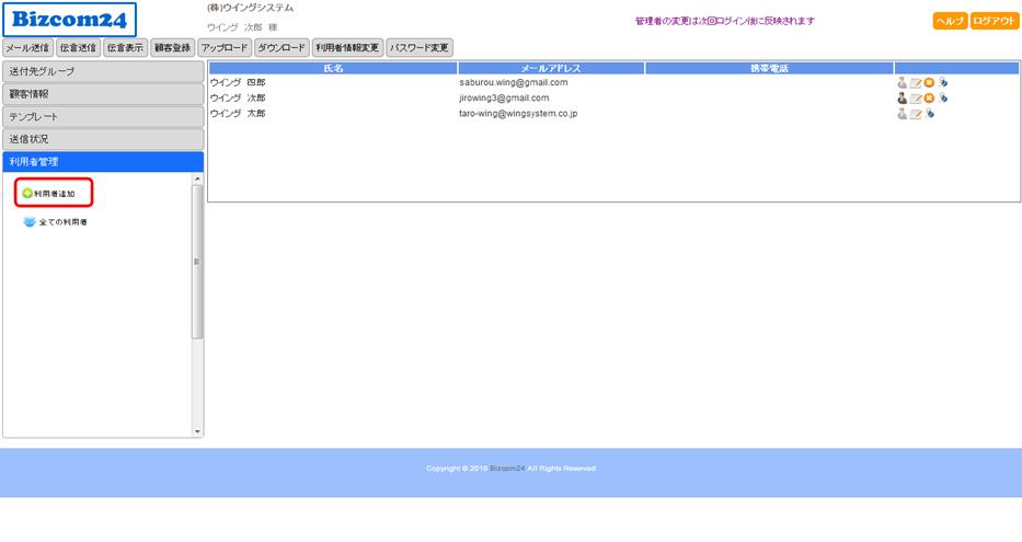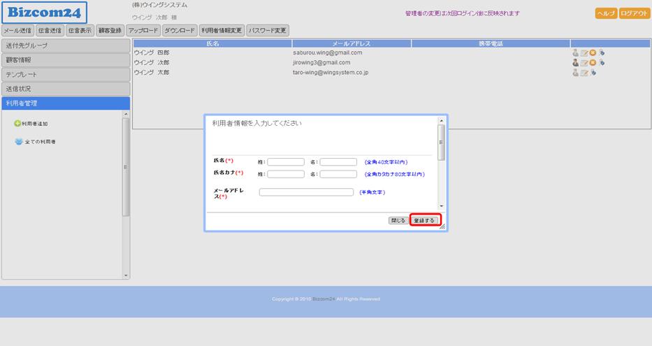 利用者追加は、Bizcom24の利用者を登録する操作です。