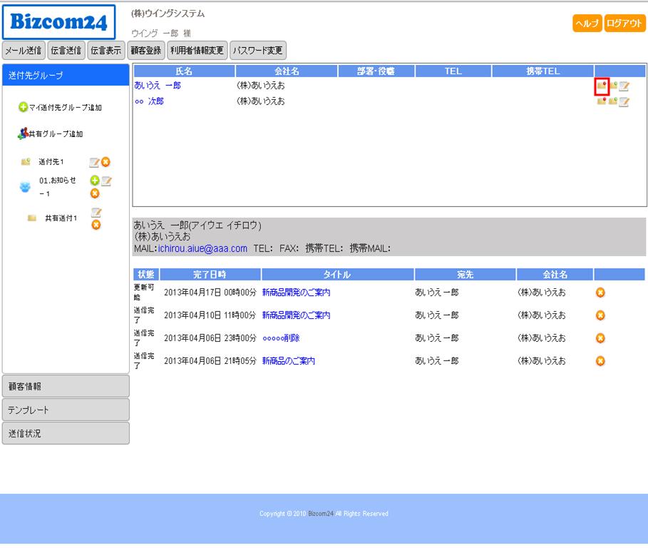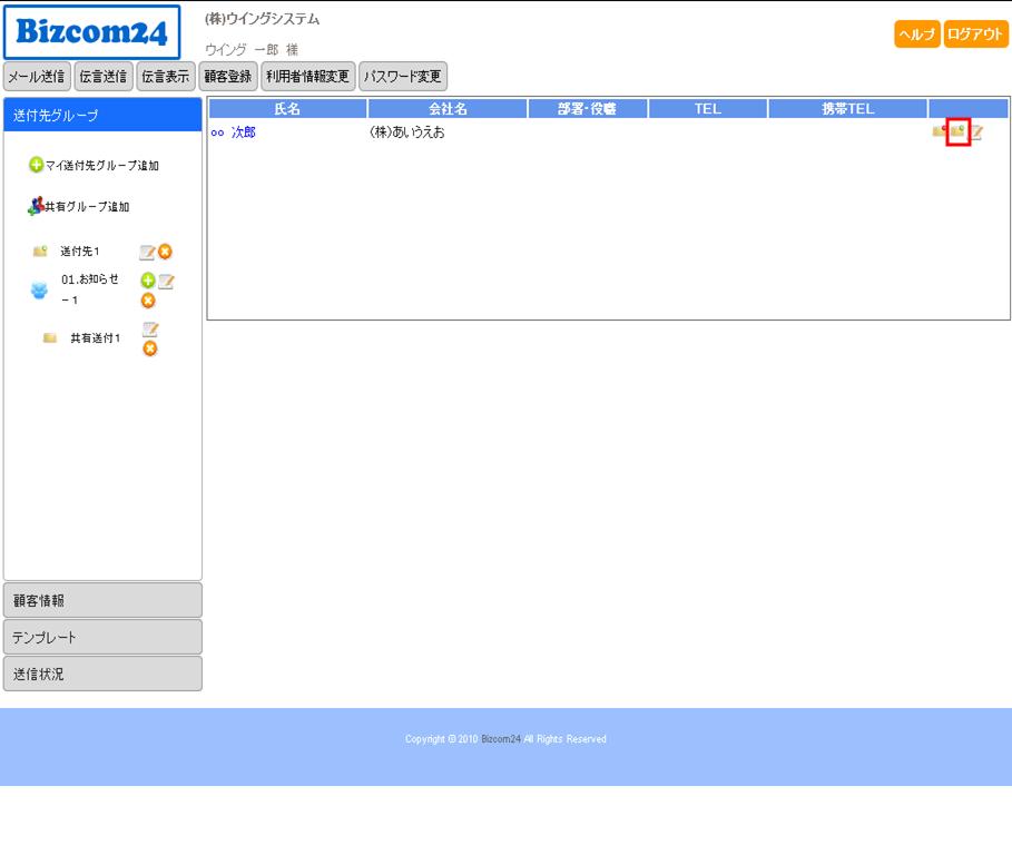 右メニュー上段のグループ削除アイコンをクリックすると送付先グループの顧客を削除することができます。