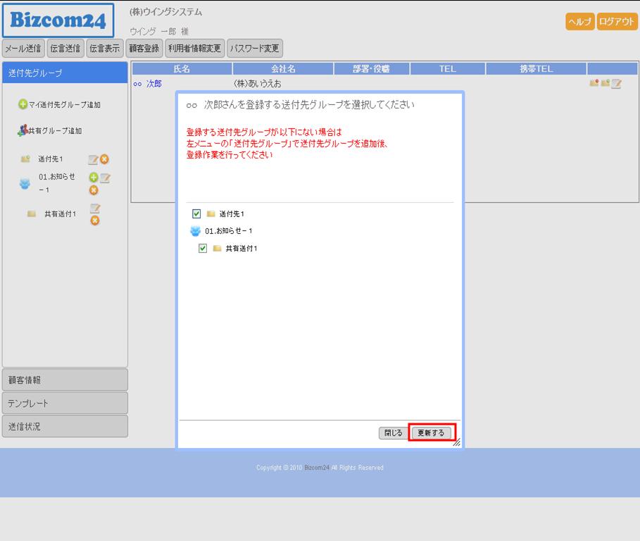 送付先グループ名を入力後、「登録・更新する」をクリックしてください。